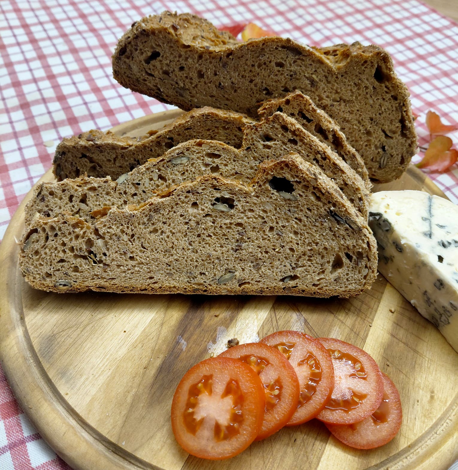 Zutaten: Dinkelmehl, Emmer-Vollkornmehl, Roggenmehl, Weizenmehl, Natursauerteig, geröstete Sonnenblumen- und Kürbiskerne, Leinsaat, Frischquark, Salz, Hefe, Wasser, Gewürze